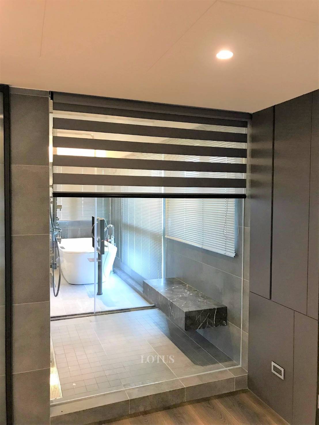 浴室的隔間玻璃使用調光捲簾,可讓空間感覺更舒適,兼顧隱私與採光