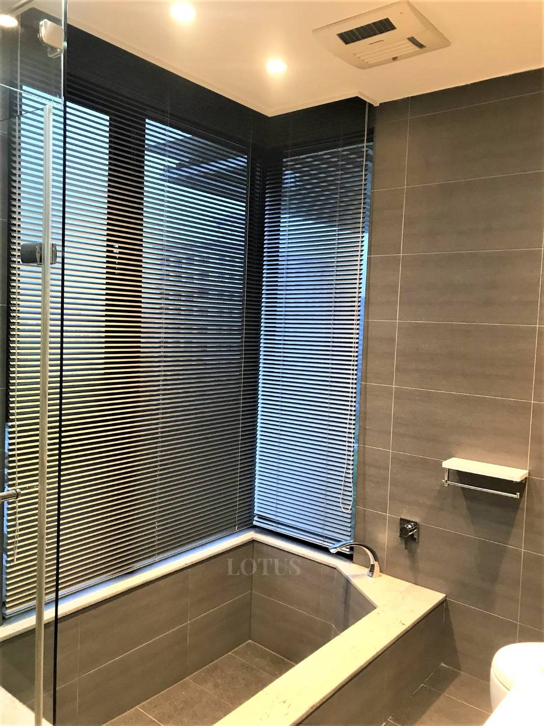千萬不要忽略浴室的窗簾搭配,許多設計師,都喜歡利用鋁片百葉的線條感來裝飾浴室,防潮且時尚